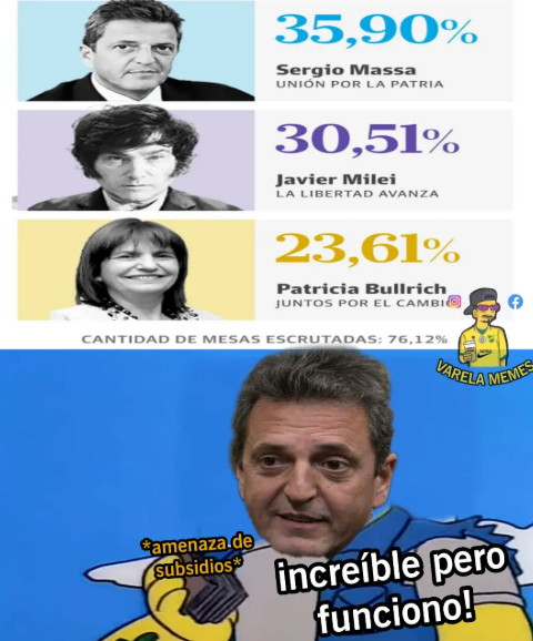 Durante las elecciones legislativas y primarias, se observaron memes que hacían referencia a las campañas políticas locales, muchos de ellos compartidos por jóvenes en redes sociales. Estos contenidos, como el que circuló con el logo Varela Memes durante las PASO 2023, combinaban datos electorales con humor gráfico para comentar, en tono irónico, las narrativas de campaña. En ese caso, se superponía el rostro de Sergio Massa en una plantilla animada con la frase “¡Increíble, pero funcionó!”, sugiriendo que la mención de subsidios habría influido en el resultado, sin establecer una relación causal directa.